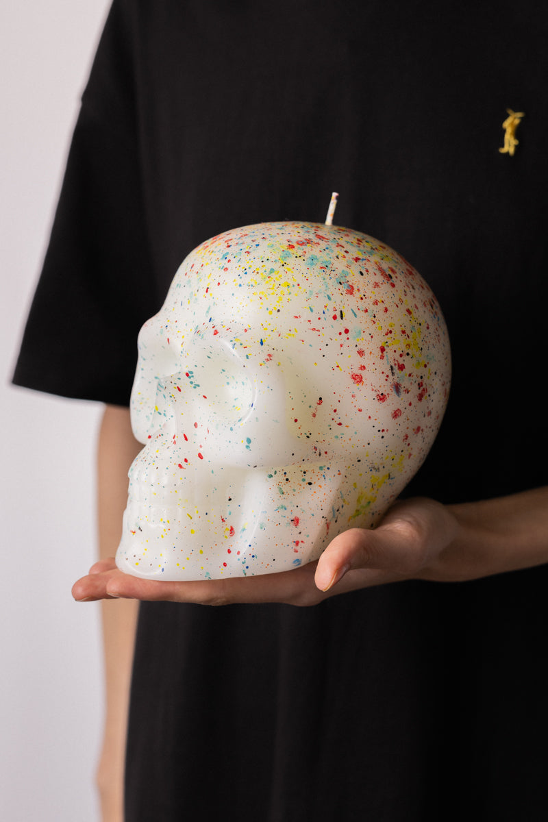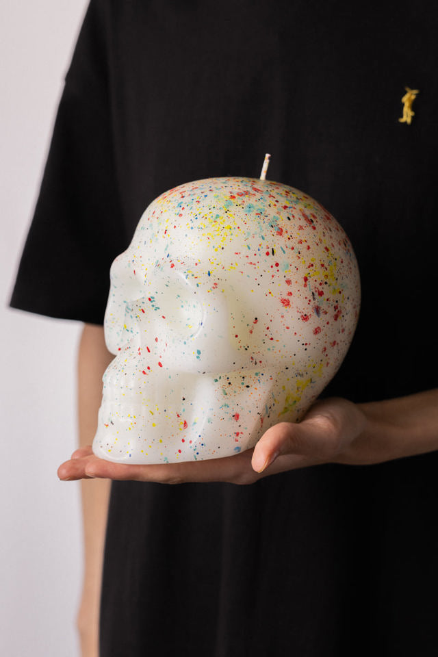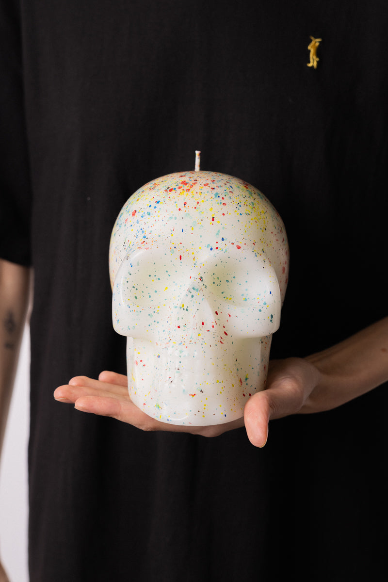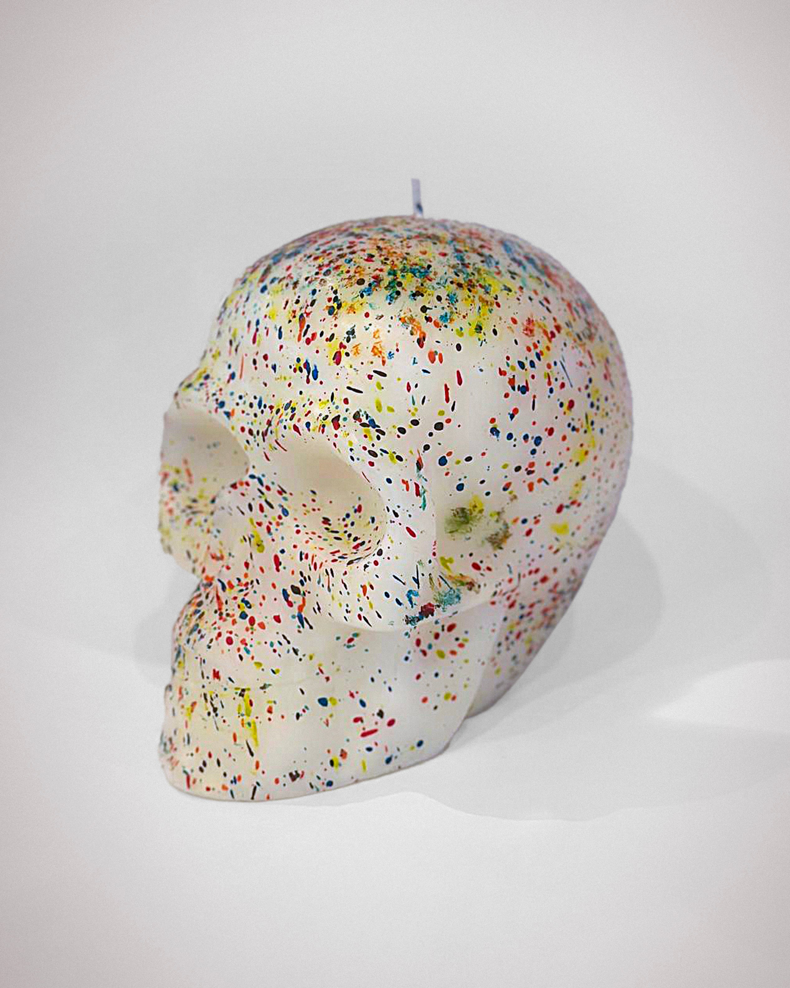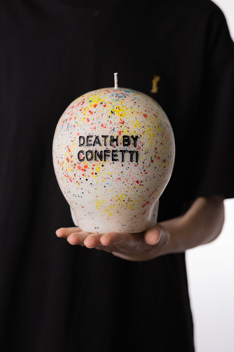 Inspired by Johnny's Death By Confetti painting, this colorfully morbid candle is designed to bring you joy and relaxation. The skull is smothered with psychedelic confetti and engraved with 'Death By Confetti' on the rear.