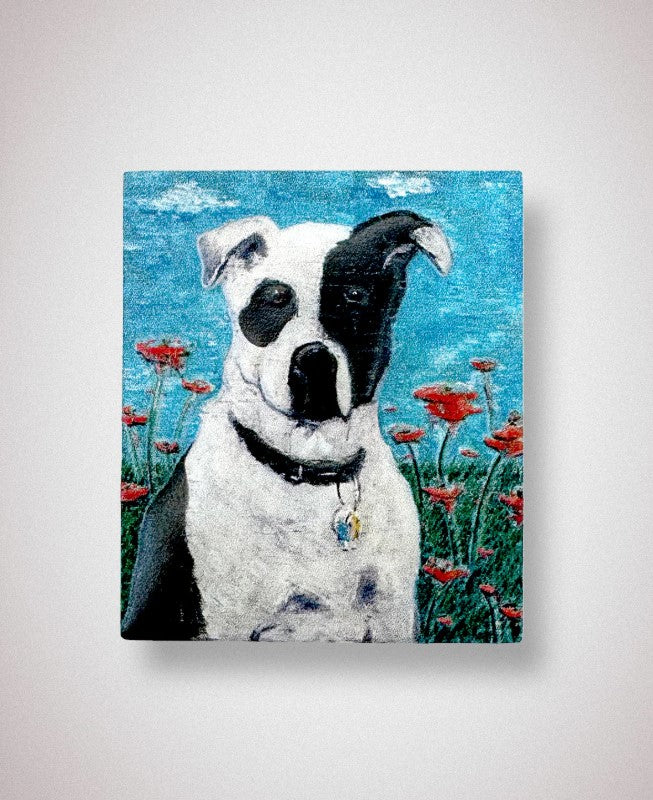 This hand-made 3D resign magnet portrays Johnny’s dearly departed Pit Bull-Boxer terrier; who the artist immortalised in a painting of the same name. Mooh can be seen basking in a sunlit majestic poppy field; illuminated by its dreamy pastoral quality. The print is an affectionate tribute to a soul most loved.