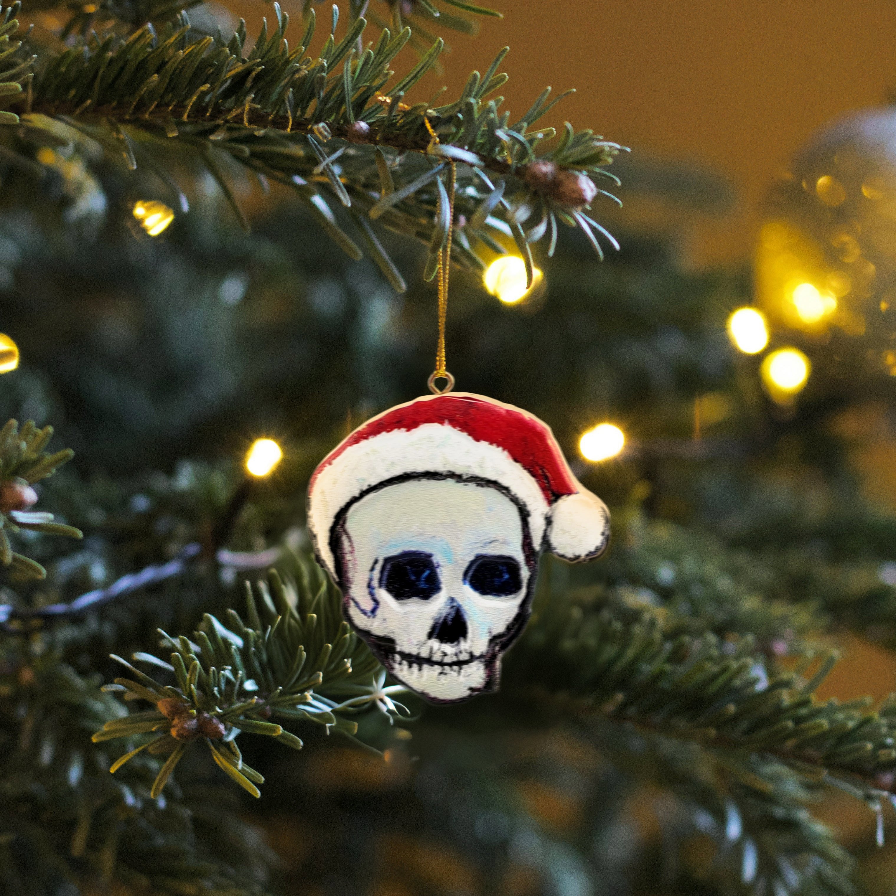 Based on one of JD’s iconic skull paintings from the exhibition, this ornament reimagines the classic Santa hat with a dark and festive twist. It’s the perfect decoration for those who enjoy blending unconventional art with holiday spirit.