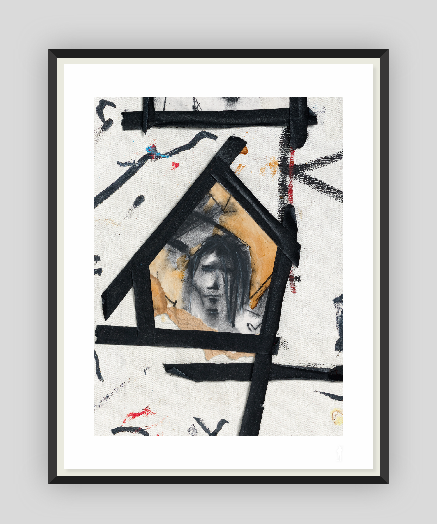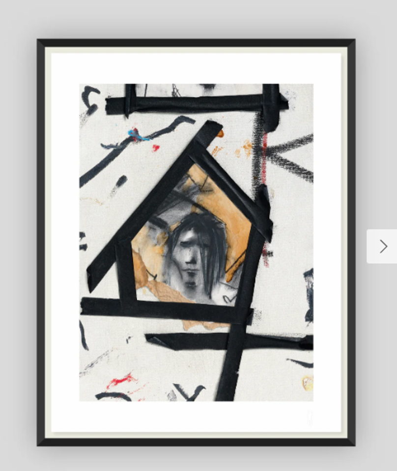 The House That Johnny Built is a captivating limited-edition print derived from Johnny’s 1996 artwork Enclosed. It is featured heavily in the Black Box film that is the centrepiece of A Bunch OF Stuff, and portrays the transitory nature of the artist’s early life. This print focuses on a striking section of the original artwork, where the artist’s self-portrait sits within a house-shaped frame made from black tape. The figure's confinement within this frame evokes themes of isolation and restriction, which are counterbalanced by the playful, dynamic lines beyond it. This interplay between light and dark, heaviness and levity, is characteristic to Johnny’s work, offering both emotional depth and whimsy.