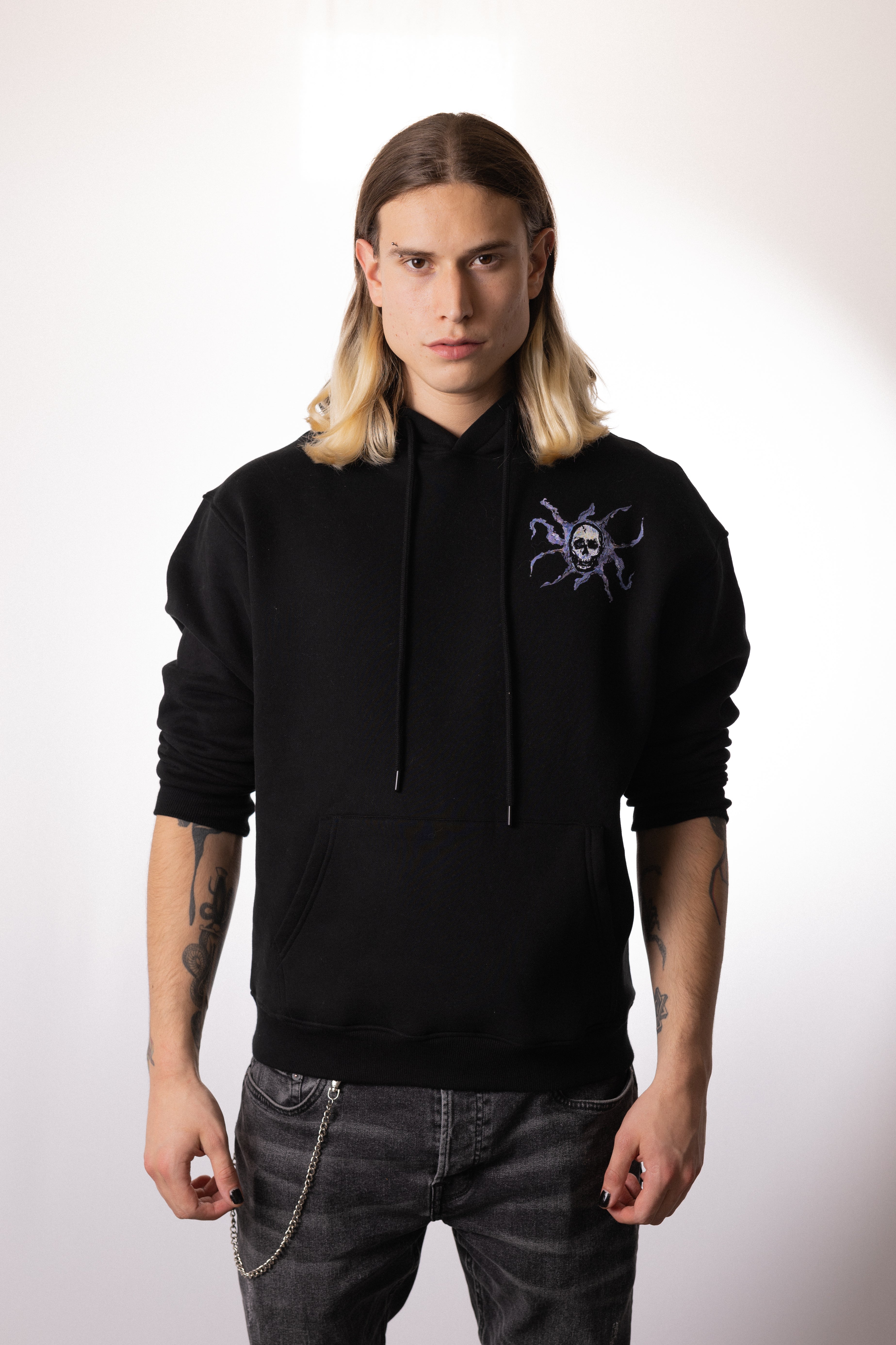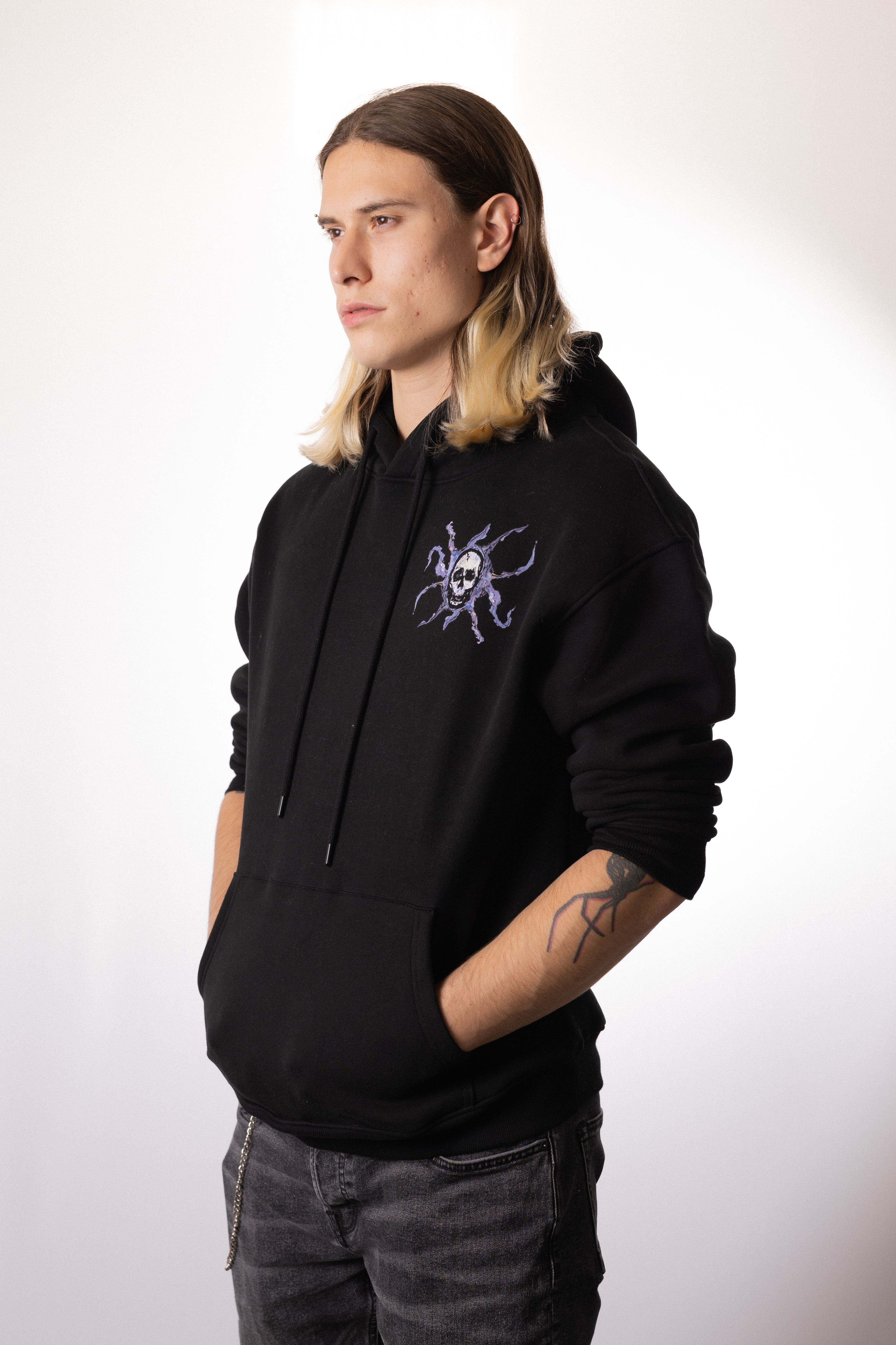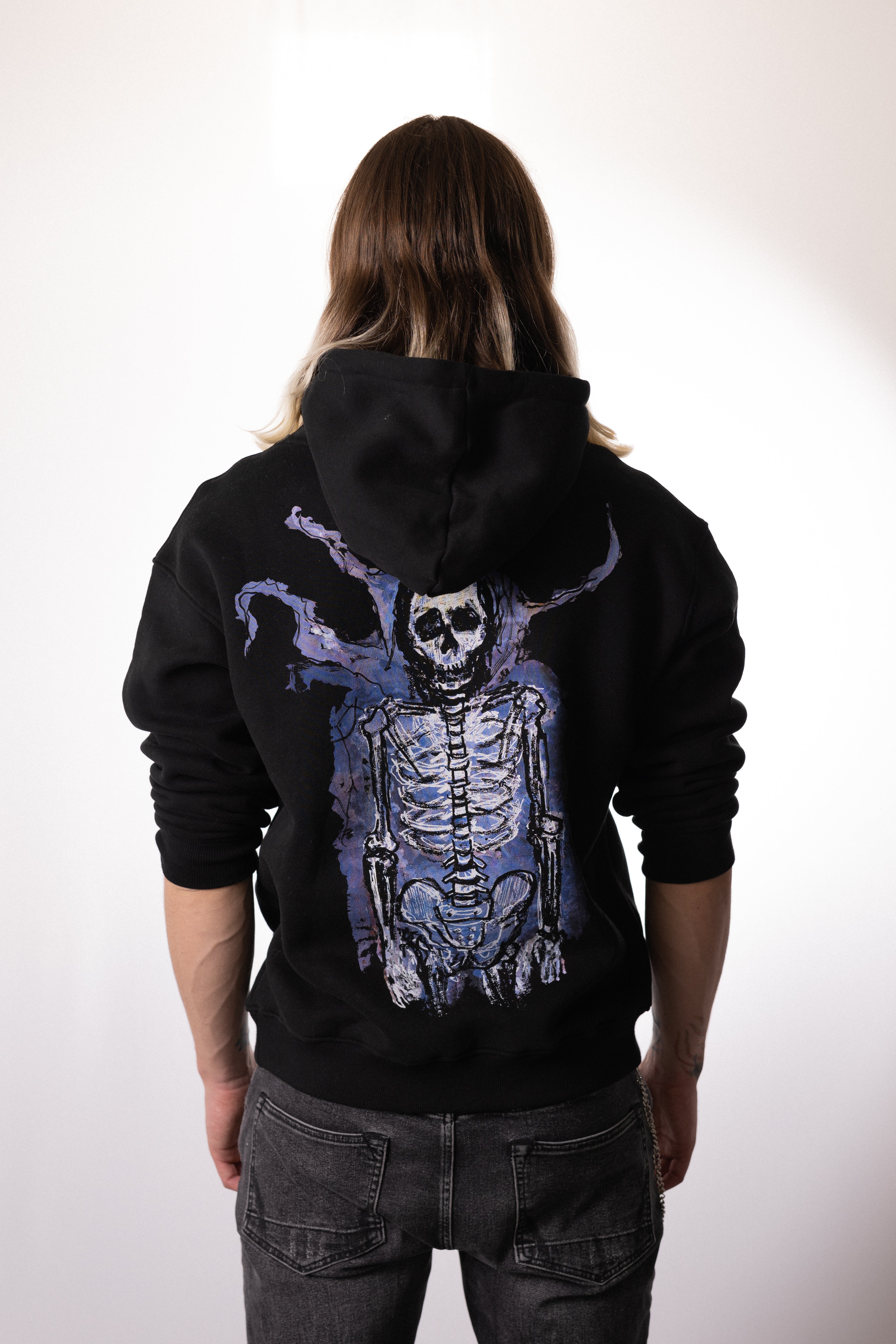 The Skelly black hoodie features a striking skeleton back print. Johnny Depp’s fascination with death and darkness is evident in this design, reflecting the skulls and skeletons that populate his homes.