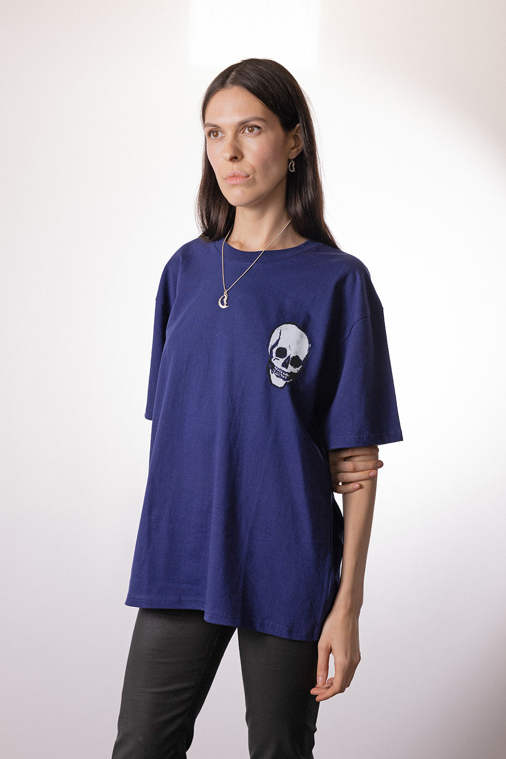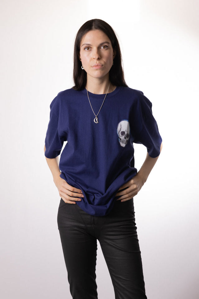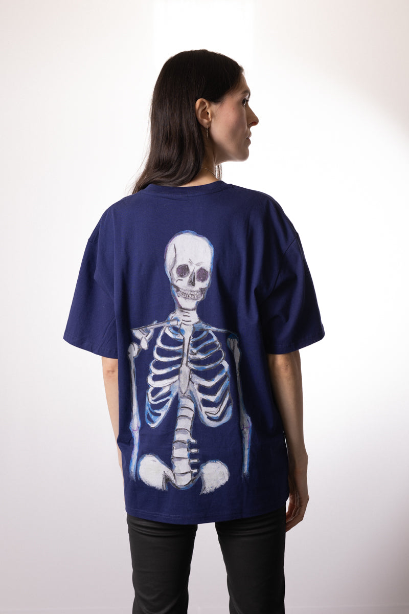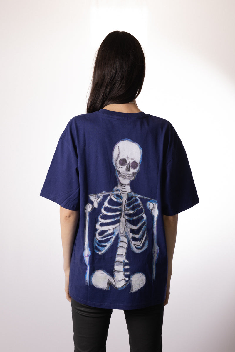 The blue Skelly t-shirt features a striking skeleton back print. Johnny Depp’s fascination with death and darkness is evident in this design, reflecting the skulls and skeletons that populate his homes and pictures.