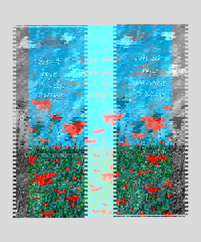 This poster is a wink to the majestic poppy field where Mooh (Johnny's dearly departed dog) is painted frolicking in the sun. Here, the artist brings the landscape into the foreground and illuminates its dreamy pastoral quality with the words: "I miss and love you and I will sleep now." It's an affectionate tribute to a soul most loved.