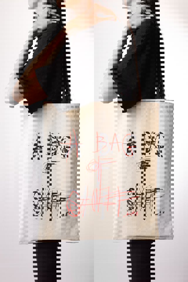 The “A Bag of Stuff” Tote, inspired by the A Bunch of Stuff exhibition, features durable natural fabric, black straps, and a playful printed design. It’s the perfect blend of art and practicality for carrying your daily essentials.